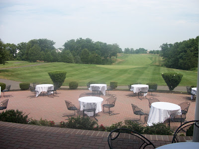 The middle rotunda table displayed their wedding cake AND their groom's cake as well as the toss bouquet. The side tables were for place cards, etc.